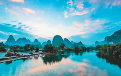 桂林天气如小孩的脸,变化倏忽,景观也随之幻化万千。晴朗时山清水秀,蓝天、白云、青山倒映水中,是一幅柔丽的水彩画。沿岸山重水复,河流因山而转,每一转弯都是一阵惊艳——清潭、流泉、高松、奇石、云影……忽然天色转阴,群峰云雾缭绕,山水景物如诗如画,则是一幅意境空灵的泼墨画。