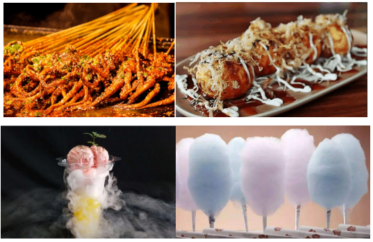 还有多种网红小吃、甜品、饮品、传统口味、地方特色……羊肉串、爆烤鱿鱼、长沙臭豆腐、泰芒了、章鱼小丸子、黄金虾球、旋风薯塔、武汉热干面,还有小朋友们最爱的网红冒烟冰激凌、七彩棉花糖等各种风味美食等你来尝!