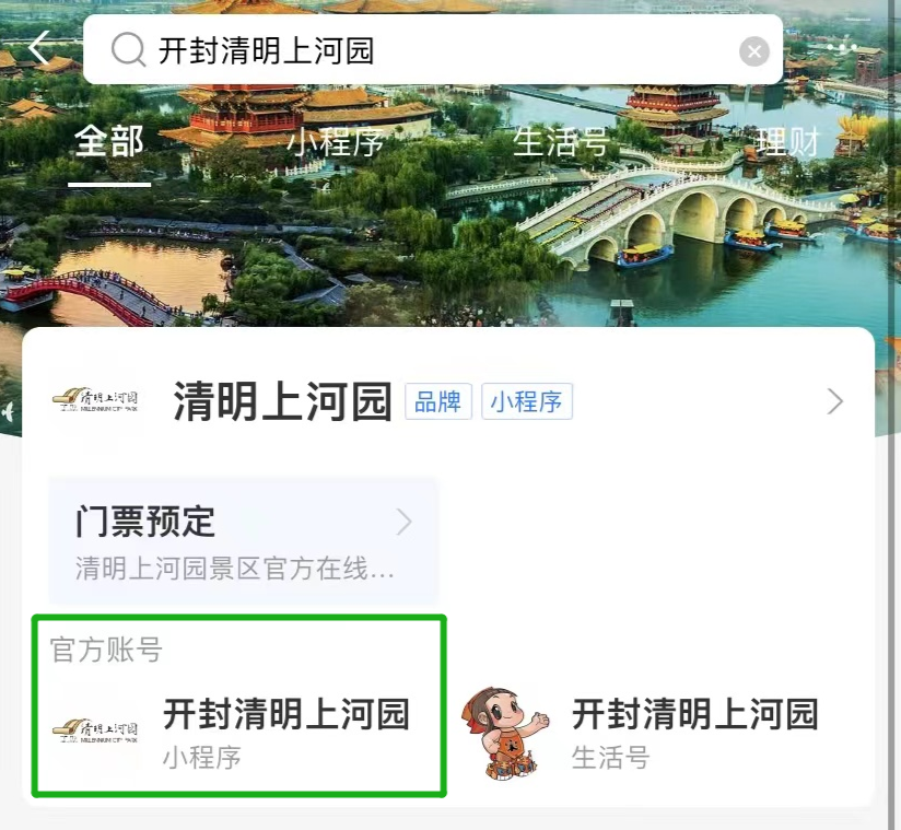 打开支付宝,搜索“开封清明上河园”小程序,点击“开封清明上河园”小程序,进入清明上河园官方商城。
