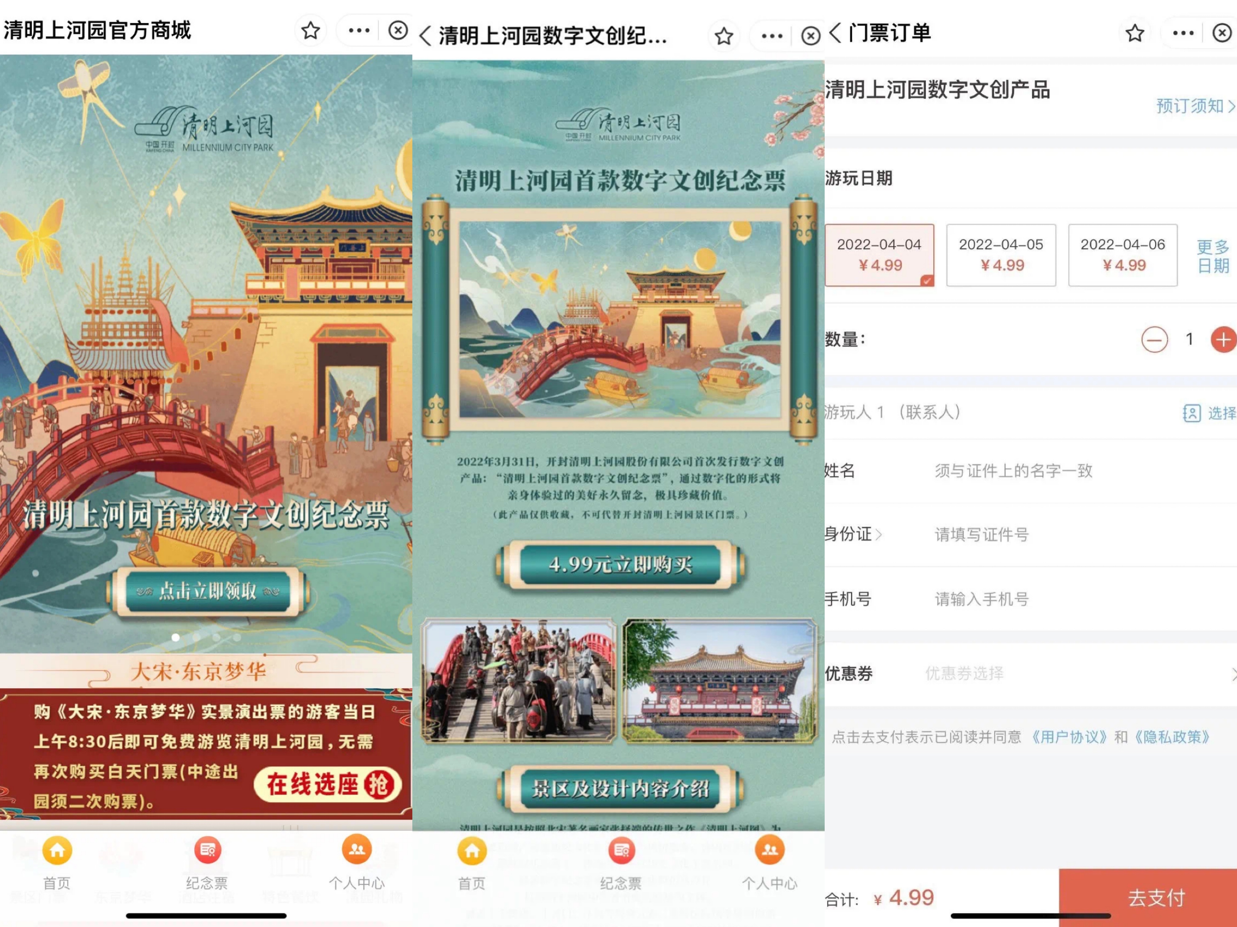进入清明上河园官方商城,点击清明上河园首款数字文创纪念票图片,进入纪念票详情,点击界面中4.99元立即购买,填写购买人信息后去支付即可。