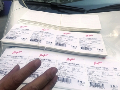 警方查获的涉嫌假冒奔富407红酒的中文背签