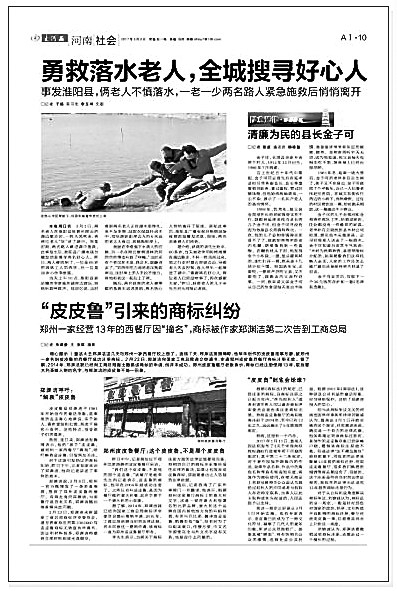 2017年3月3日《大河报》AⅠ·10关于“皮皮鲁”商标之争的报道