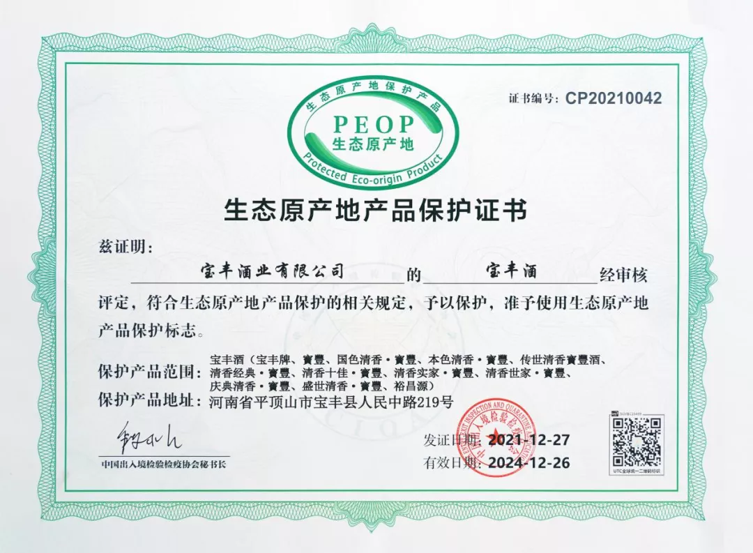 过去一年,宝丰酒也载满盛誉。在第13届华樽杯中国酒类品牌价值200强研究报告中,宝丰酒业以197.49亿元的品牌价值,位列中国白酒生产企业第34名,排名前进4位;在2021比利时布鲁塞尔国际烈酒大奖赛中,宝丰酒再次夺得金奖;在2021年国际酒类大奖赛(ISGC)中,宝丰酒同样获得金奖,实现了双赛双金奖的荣誉;2021年12月,宝丰酒业更是获得生态原产地保护证书,也是首个获得该奖项的豫酒企业。