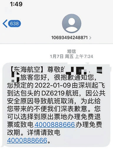 图一、图二:李小姐收到的航班取消、改签成功的通知短信。消费者供图