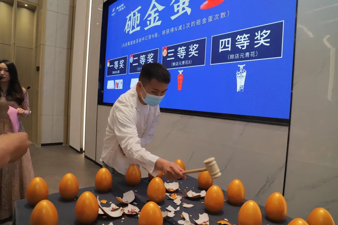 为答谢现场各位客户,会议现场还增加了“砸金蛋送好礼”的回馈活动。基于对赊店老酒品质的认可和肯定,大家纷纷认购,争取砸金蛋的机会。各位客户高举木槌,金片四溅,热闹非凡。随着砸金蛋活动的热烈进行,本次核心客户联谊会迎来高潮,现场订货金额更是远超预期。