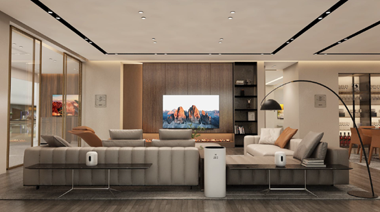 在客厅区域,从归家前奏、温馨回家、沉浸观影、休闲会客、派对模式到安心离家等模式,从下班回家到出门工作的整个过程,摄像头、台灯、窗帘、新风机、空调、扫地机器人等在智慧主机控制下协同联动,满足观影、会客、派对等场景需求。