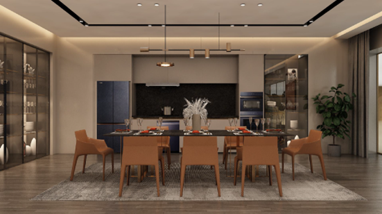 在餐厅场景,灯光照明可及时调整舒适亮度区间,联动HUAWEI Sound X音箱等可自动播放匹配场景的音乐,增进食欲。以烛光晚餐场景为例,当用户触发“烛光”场景后,餐厅关闭布帘与基础照明,氛围照明与重点照明调整至适合范围,层次丰富,享受美妙沉浸时刻。