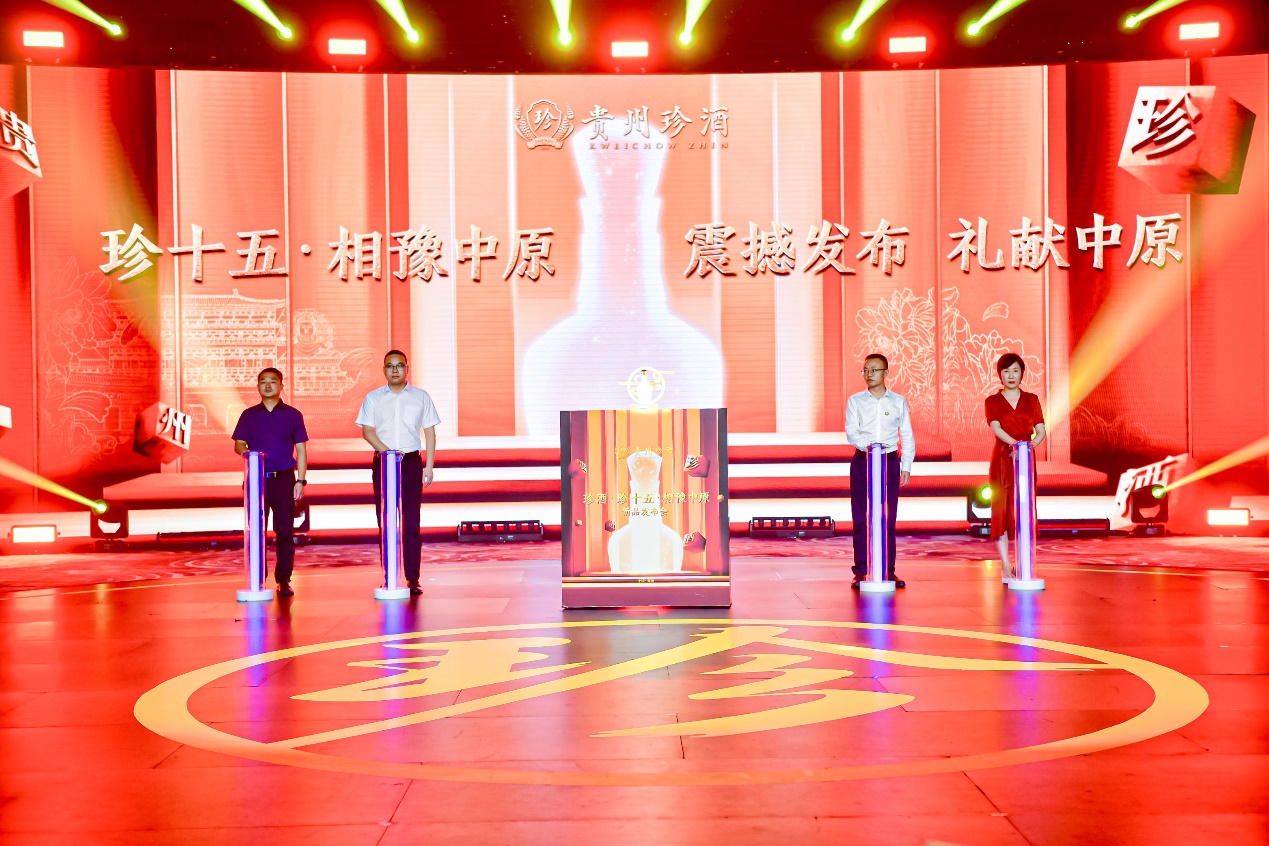 贵州珍酒河南大区总监万远开、豫中高档酒区域经理任丽馥、豫南高档酒区域经理李龙、豫北高档酒区域经理王海林一同登台,为贵州珍酒·珍十五(相豫中原)揭幕。